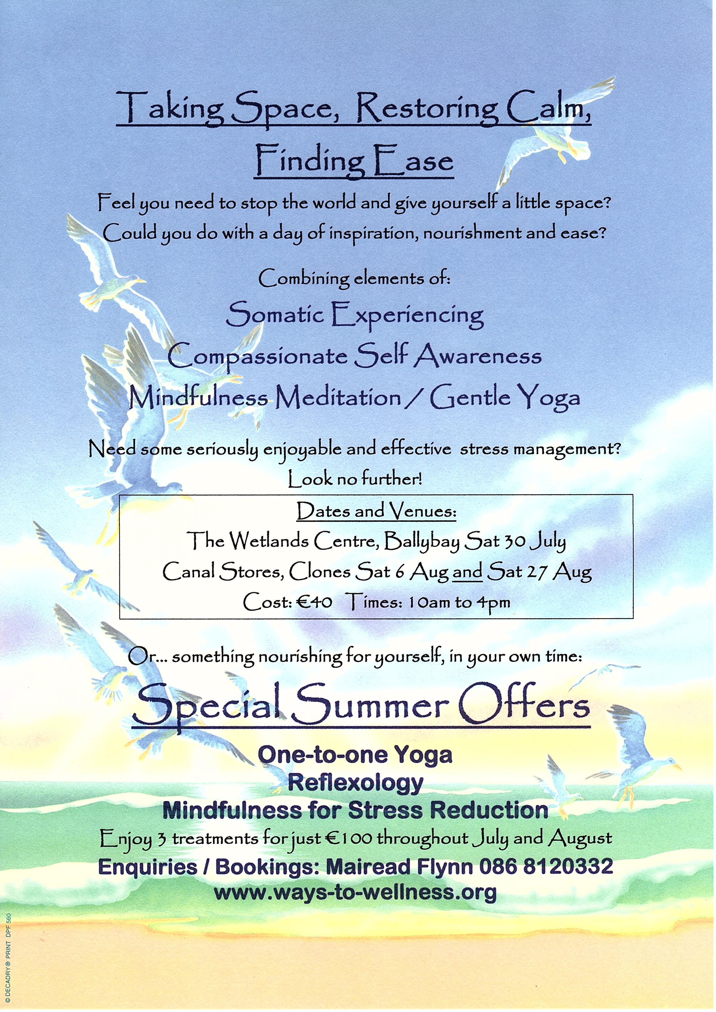 Taking space, restoring calm, finding ease… mflynnm accumulated stress, mindfulness, Somatic Experiencing, Yoga July 15, 2016July 15, 2016 1 Minute I love that in summer I don’t have many regular classes and can get creative offering some special workshops – here’s what’s on offer next few weeks… Share this: Click to share on X (Opens in new window) X Click to share on Facebook (Opens in new window) Facebook Click to share on LinkedIn (Opens in new window) LinkedIn Click to share on WhatsApp (Opens in new window) WhatsApp Click to email a link to a friend (Opens in new window) Email Like Loading... Related Published by mflynnm Teacher of Yoga and Mindfulness, Stress Management Therapist, Somatic Experiencing Practitioner, Gestalt Practitioner View all posts by mflynnm Published July 15, 2016July 15, 2016