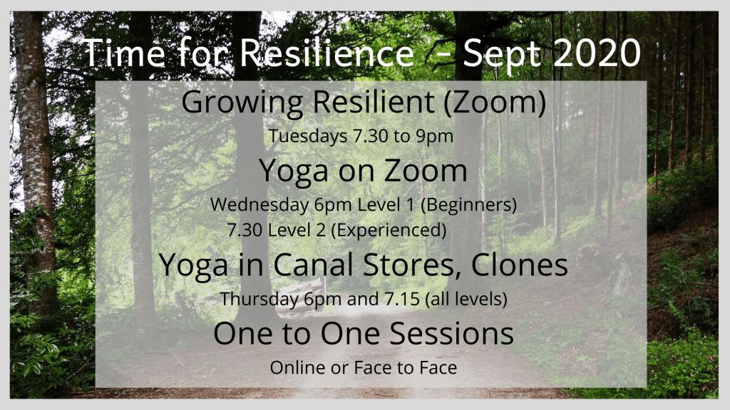 If there’s something in the above programme which grabs your interest, do get in touch with me either for more details or to book a place / make an appointment. Particularly if you’re finding the going tough and you feel the stress of these times is affecting your overall sense of well being, I’ll be happy to have a chat with you about how you might support your own resilience during this challenging time- and how I might be of help.